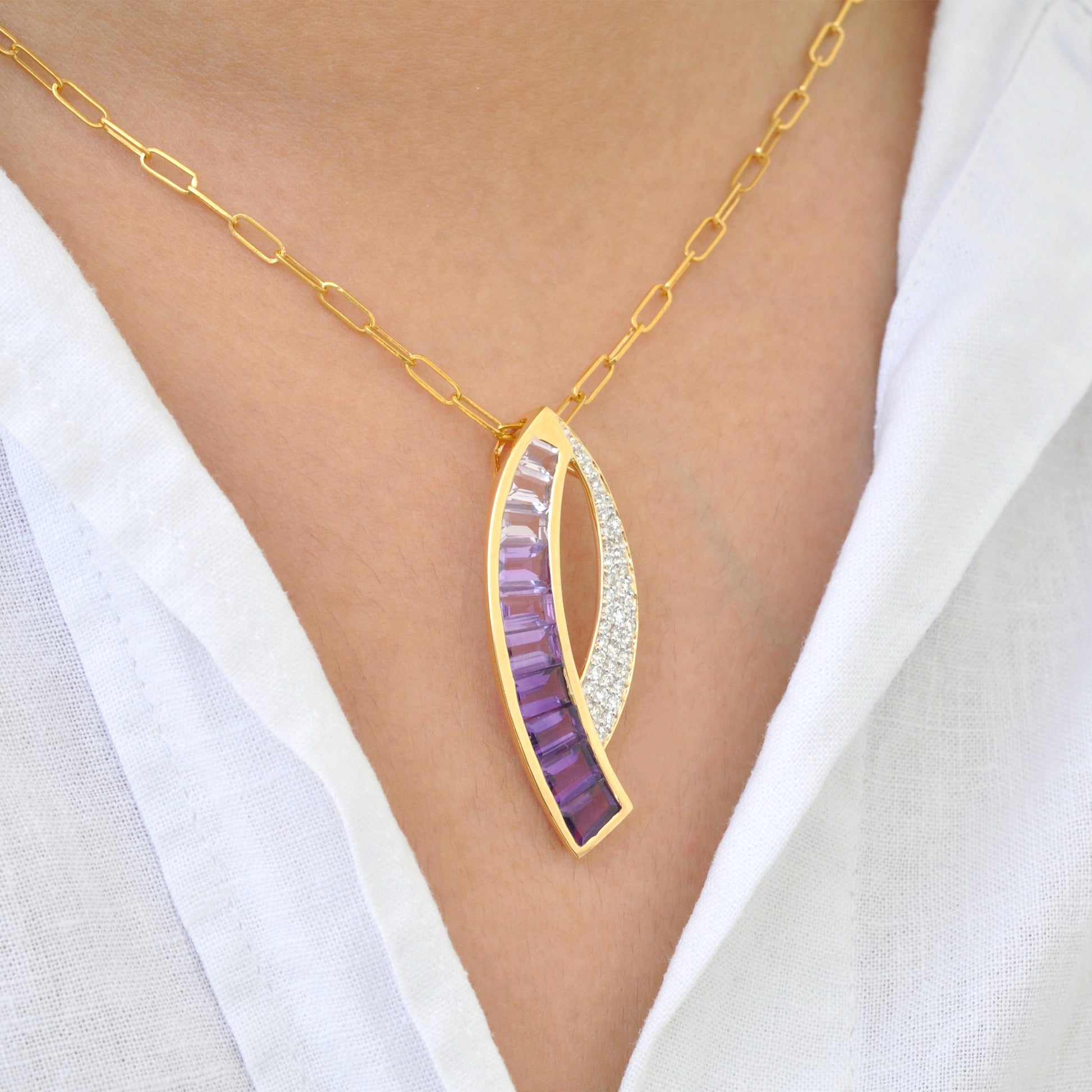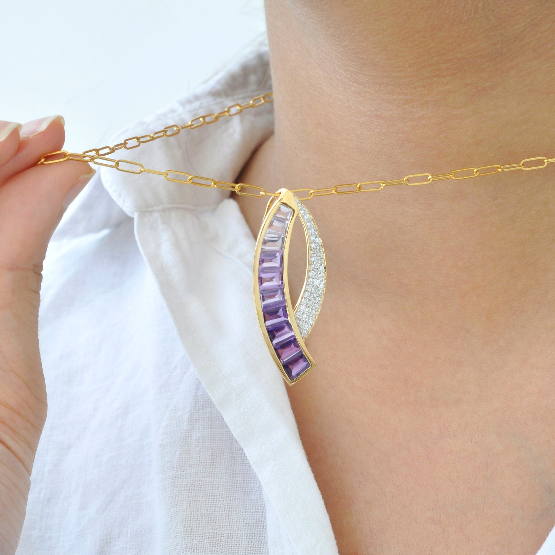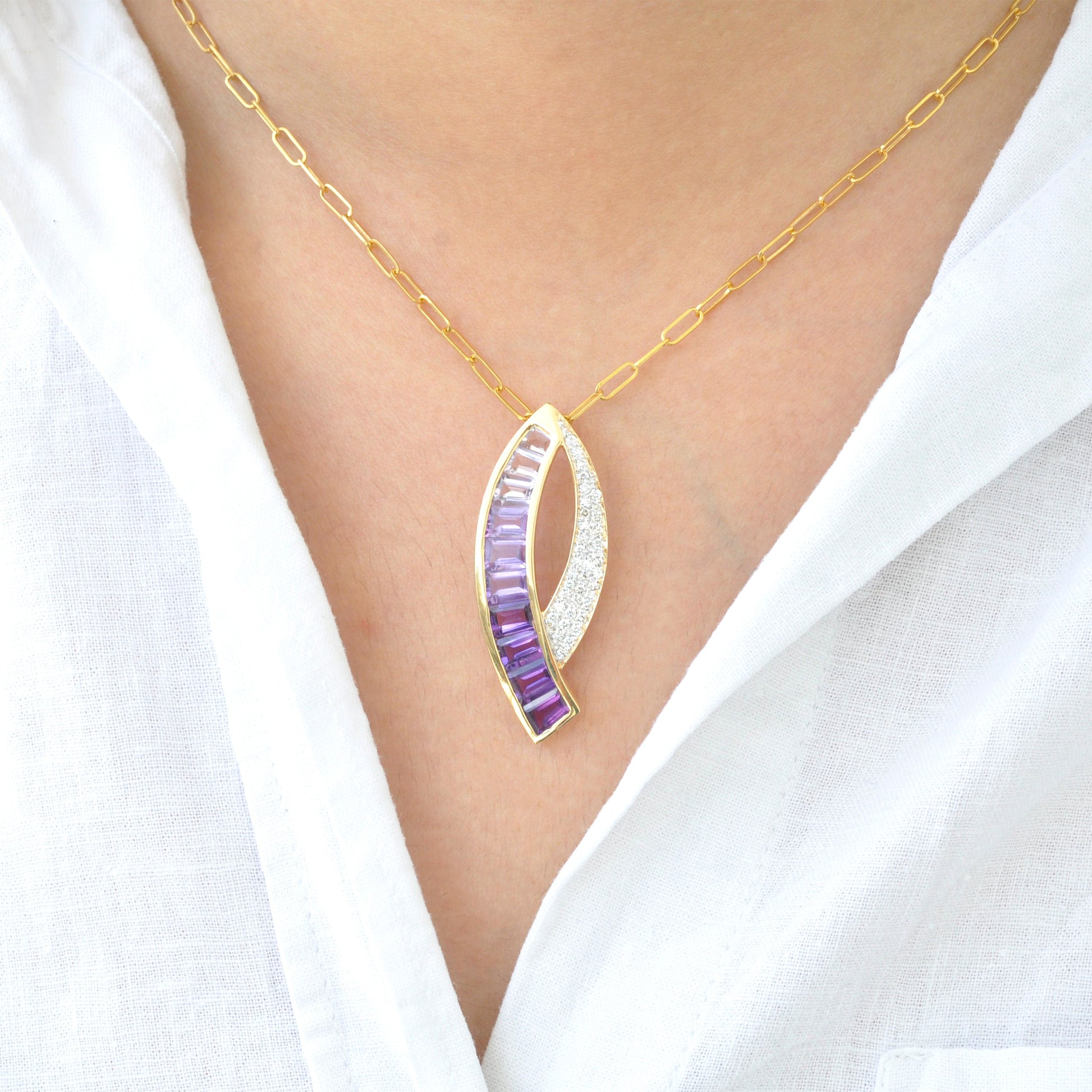 Featuring Sickle Amethyst Pendant Brooch in 18K gold, custom-cut tapered baguette amethysts in rich purple hues. This handcrafted masterpiece shimmers with diamond accents, making it a true statement of refined artistry.