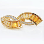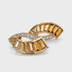 Make a bold statement with our extraordinary 18K Gold Sickle Citrine Earrings, featuring a striking ombré gradient of 16 hand-selected golden citrines. Graduating from rich amber to soft yellow, each gemstone is expertly calibre-cut into tapered baguettes and invisibly set in a seamless channel setting. Accentuated by a graceful strand of pavé-set diamonds, this contemporary design showcases revolutionary craftsmanship perfected through custom silver mold dyes and master lapidary artisanship. Sleek, sculptural, and radiant, these earrings are true showstoppers—ideal for elevating an evening ensemble with edgy sophistication and golden brilliance.