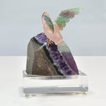 Hand-Carved Rose Quartz Bird with Fluorite Wings Natural Amethyst Base Sculpture