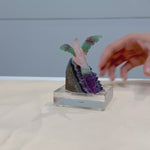 The beak of the bird is also carved from natural stone, adding an extra level of detail and authenticity to the sculpture. The intricate combination of rose quartz, fluorite, and the natural amethyst cluster base creates a harmonious balance of colors and energies. The amethyst, known for its purifying and protective properties, beautifully complements the calming qualities of rose quartz and the clarity-bringing attributes of fluorite.