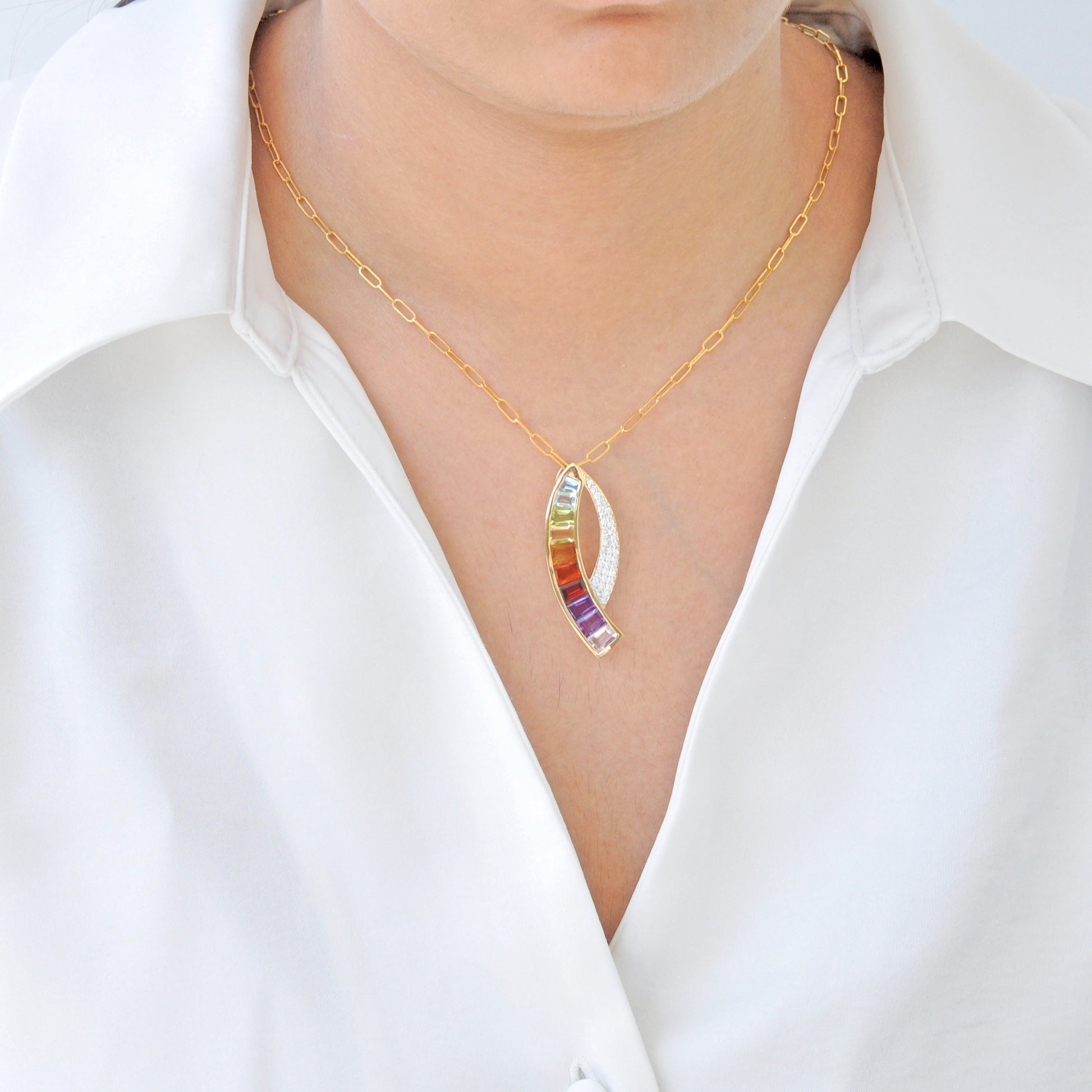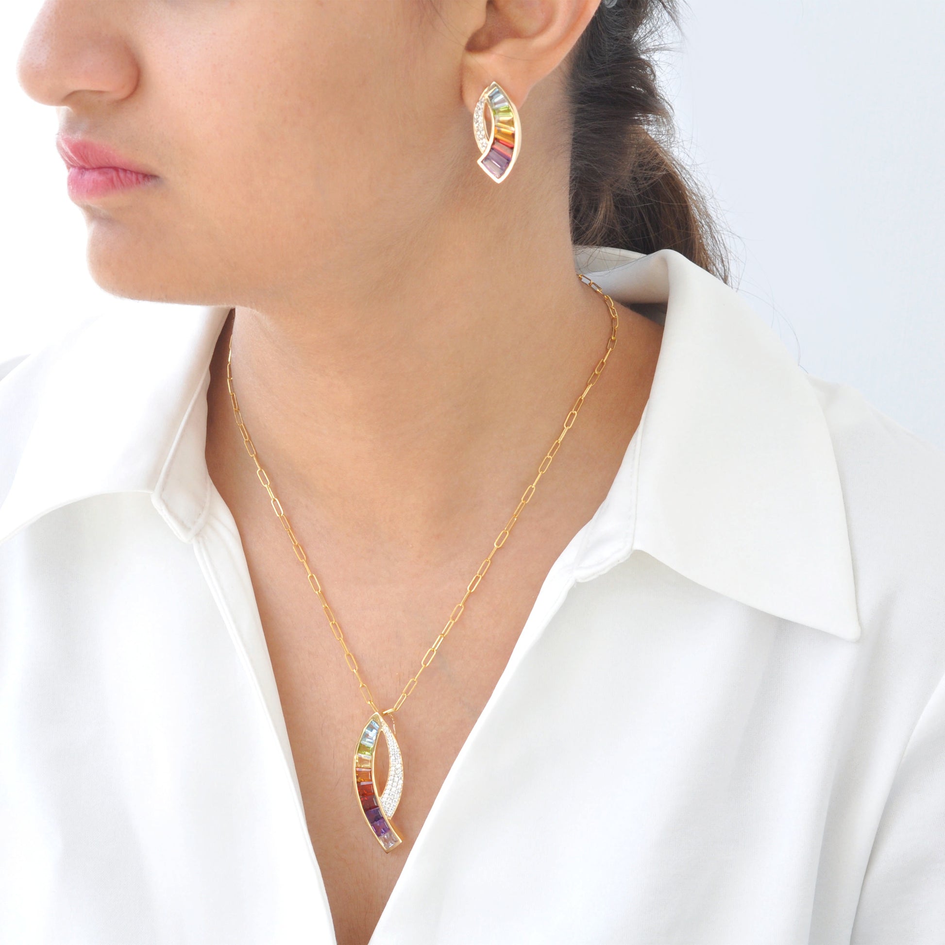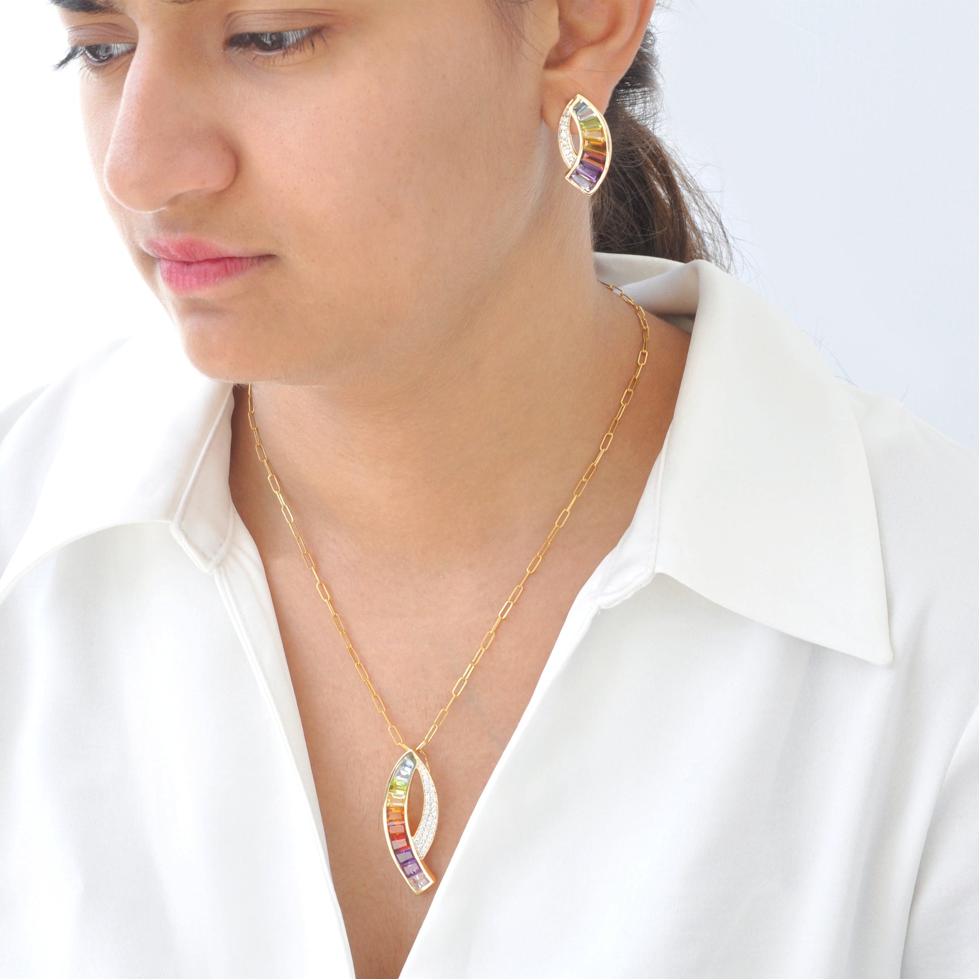 A vibrant set featuring a sickle-shaped pendant-brooch and matching earrings, adorned with tapered baguette-cut gemstones in a radiant ombré. Elegant, symbolic, and full of color.