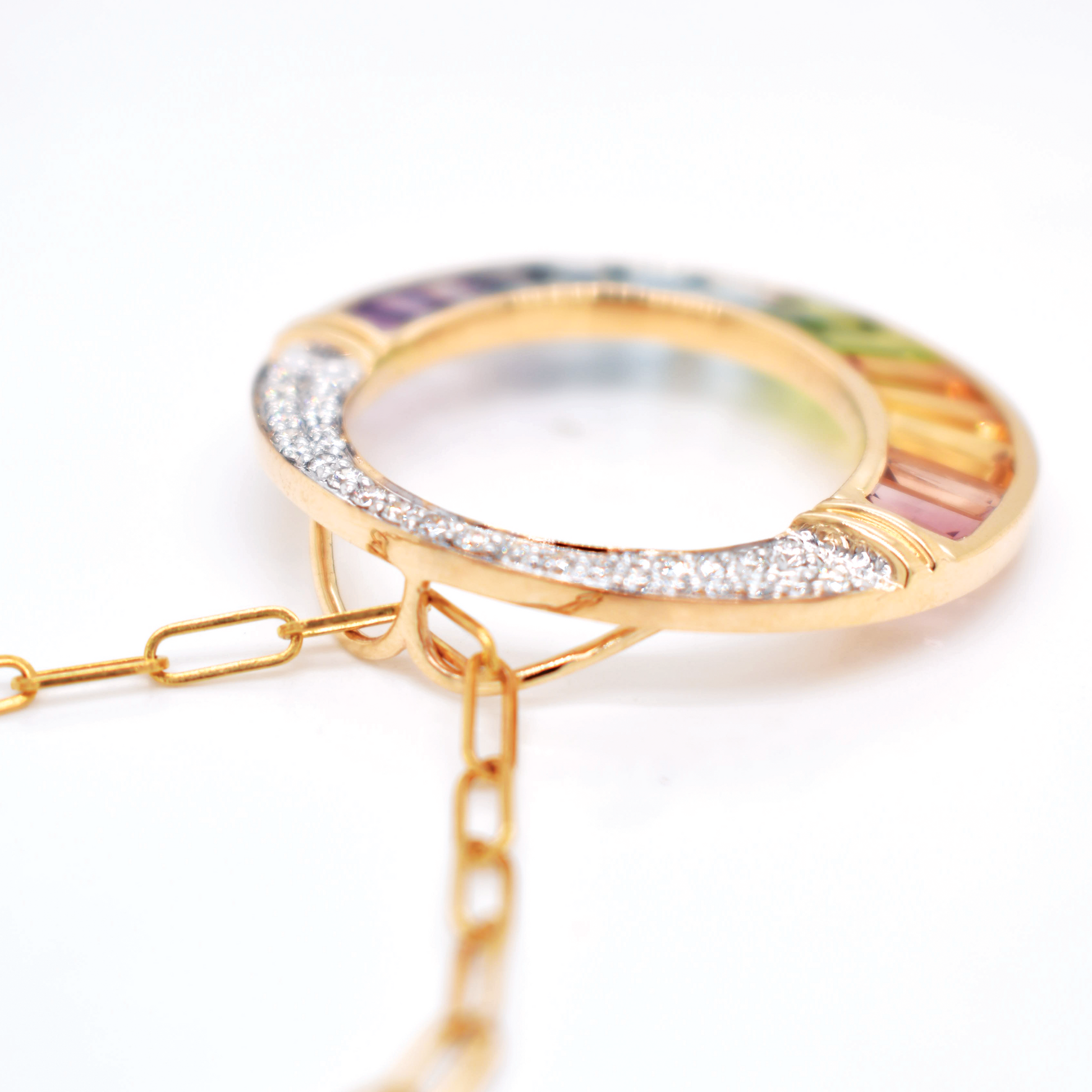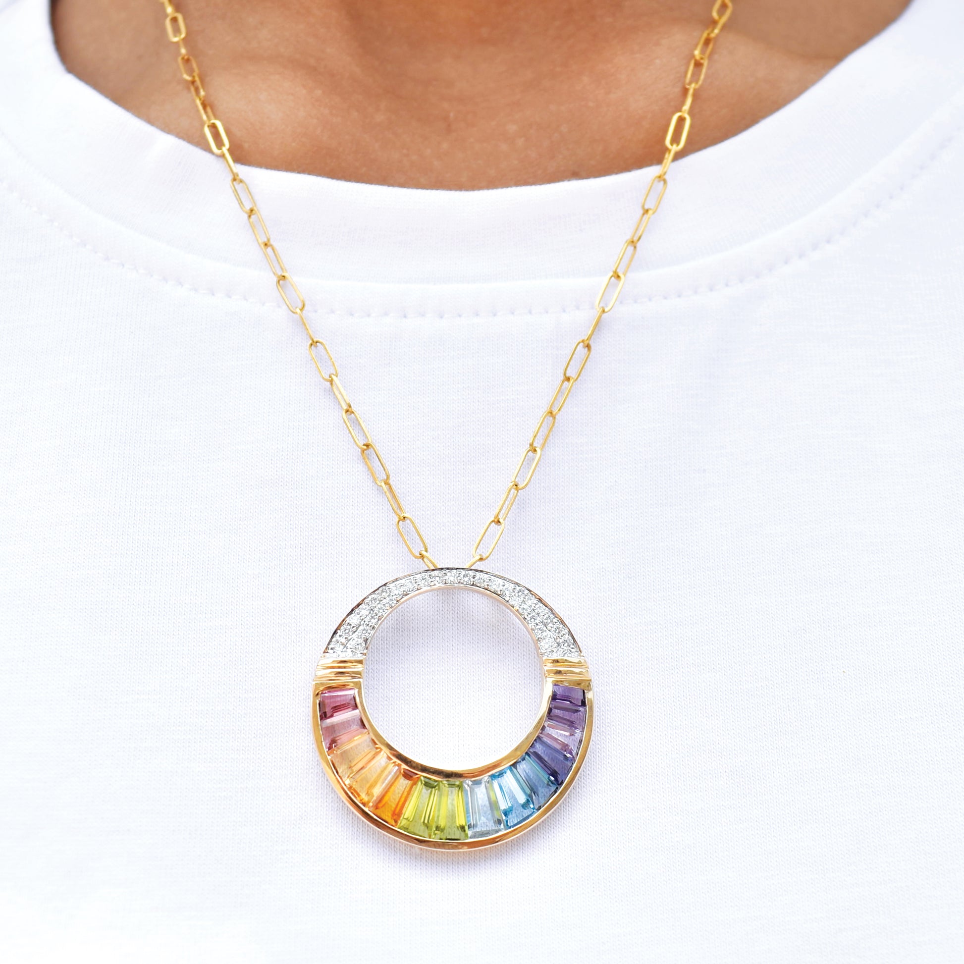 A stunning circular pendant crafted in Yellow Gold, featuring a dynamic semi-circle of meticulously set rainbow baguette gemstones, crowned with brilliant pave diamonds.