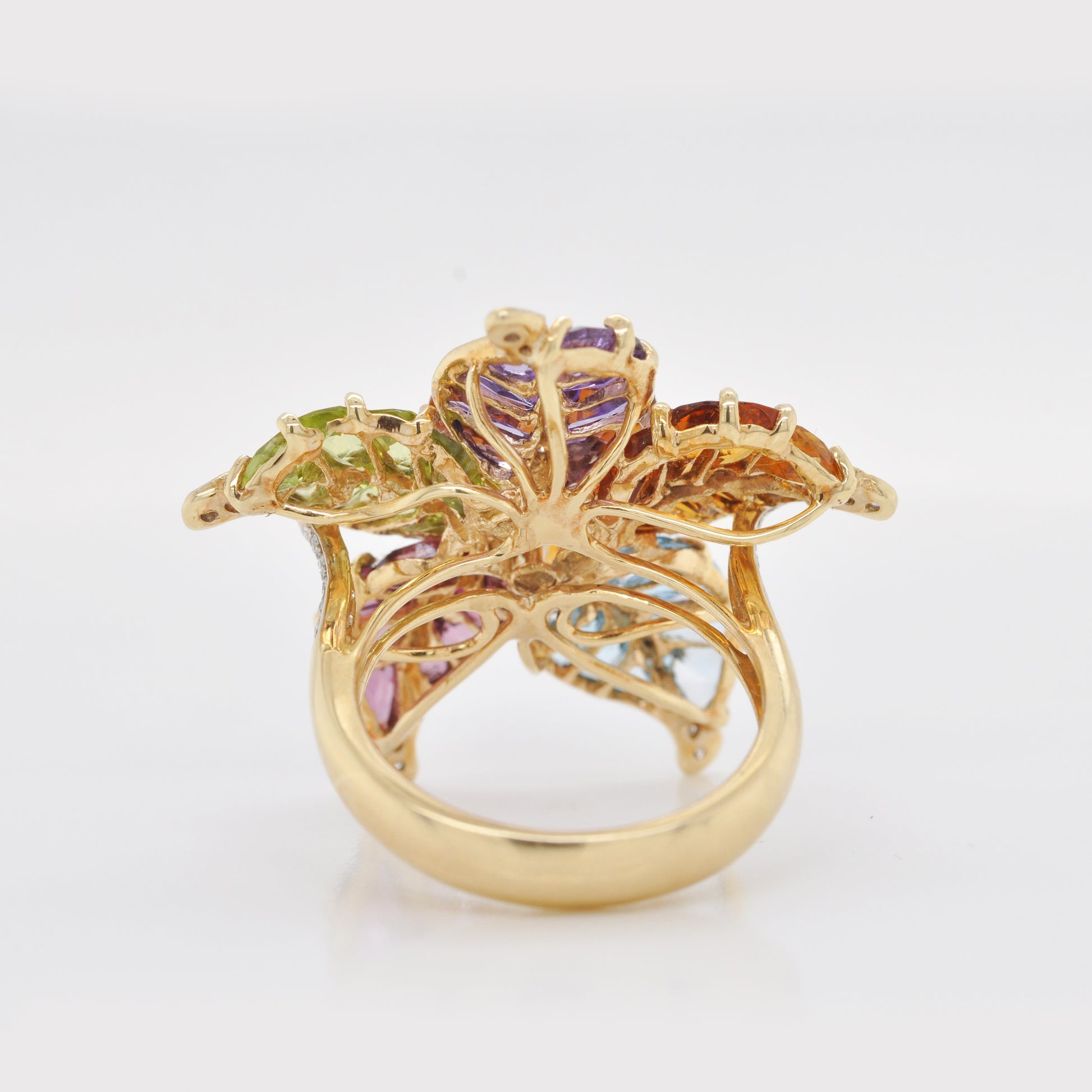 From our Couture Collection, this floral ring is an ode to nature’s geometry and the refined artistry of fine jewelry design. Handcrafted in 14K gold, it blooms into a sculpted flower, each petal meticulously set with Amethyst, Peridot, Blue Topaz, Rhodolite, and Citrine — gemstones chosen for their brilliance and perfect harmony of color. A diamond rests gracefully at the center, capturing light in a way that feels both delicate and powerful.