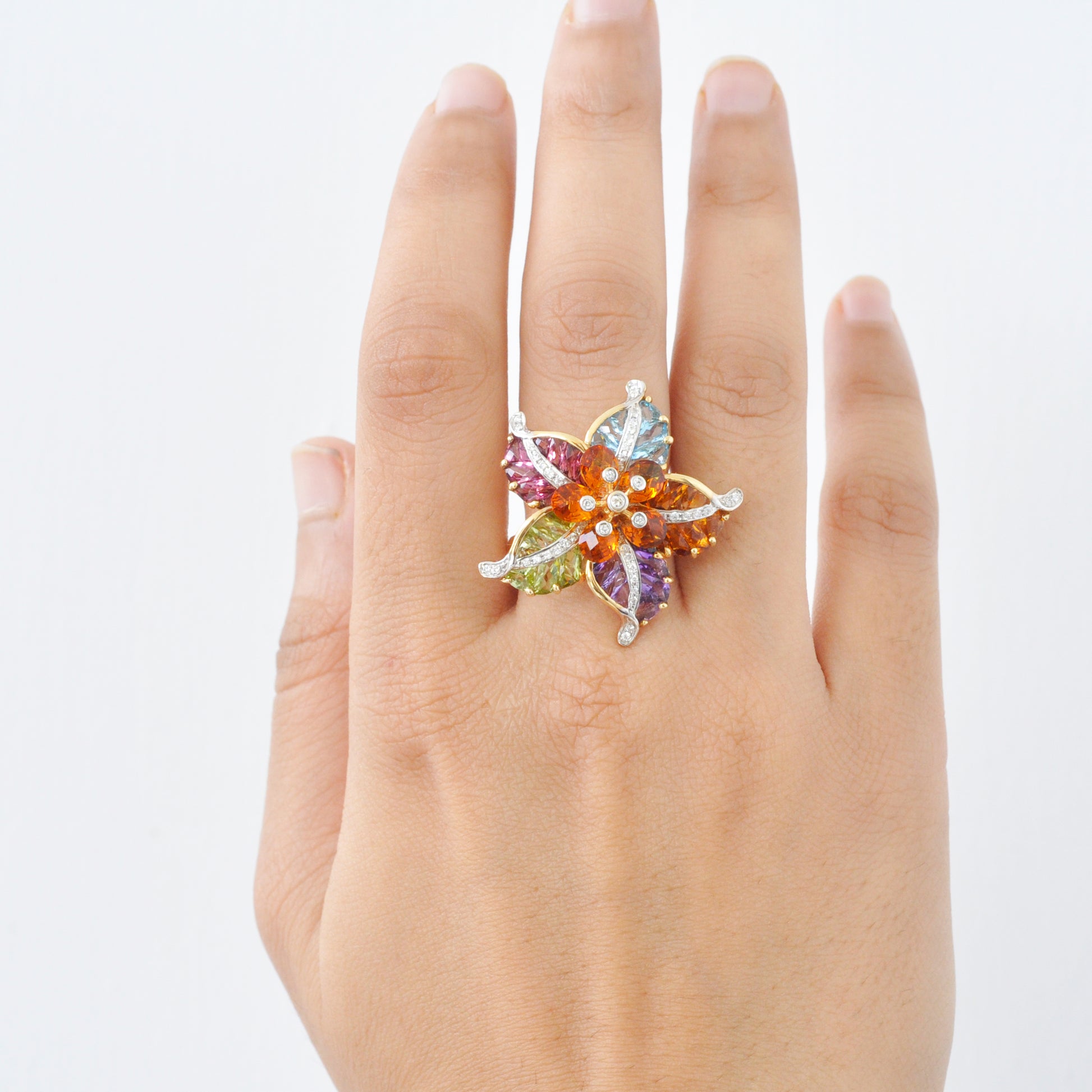 The ring’s design flows with fluid symmetry, curving elegantly around the finger for a soft yet commanding presence. Each gemstone is precisely faceted and arranged to create depth, movement, and radiance — a play of hues reminiscent of a sunlit garden in full bloom.