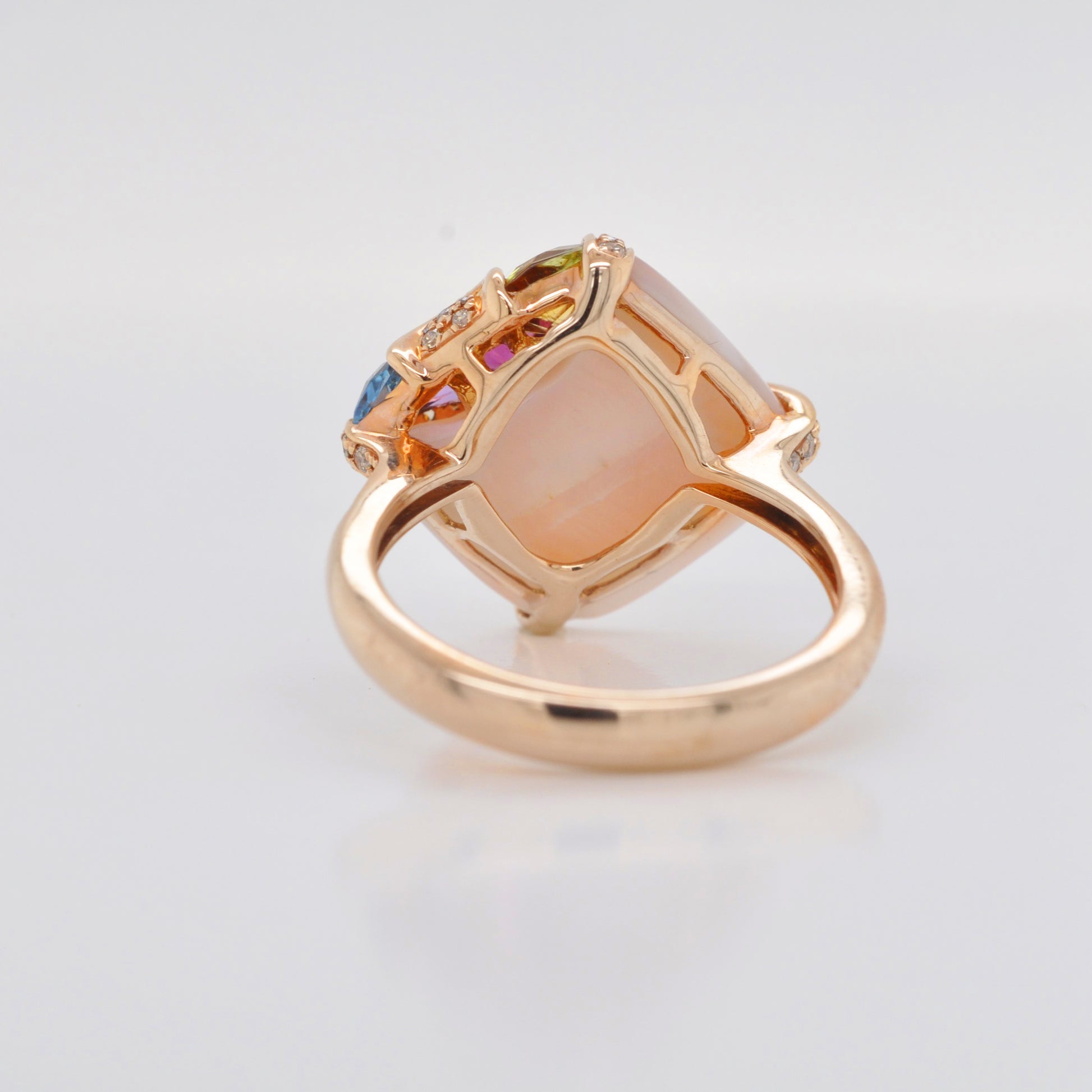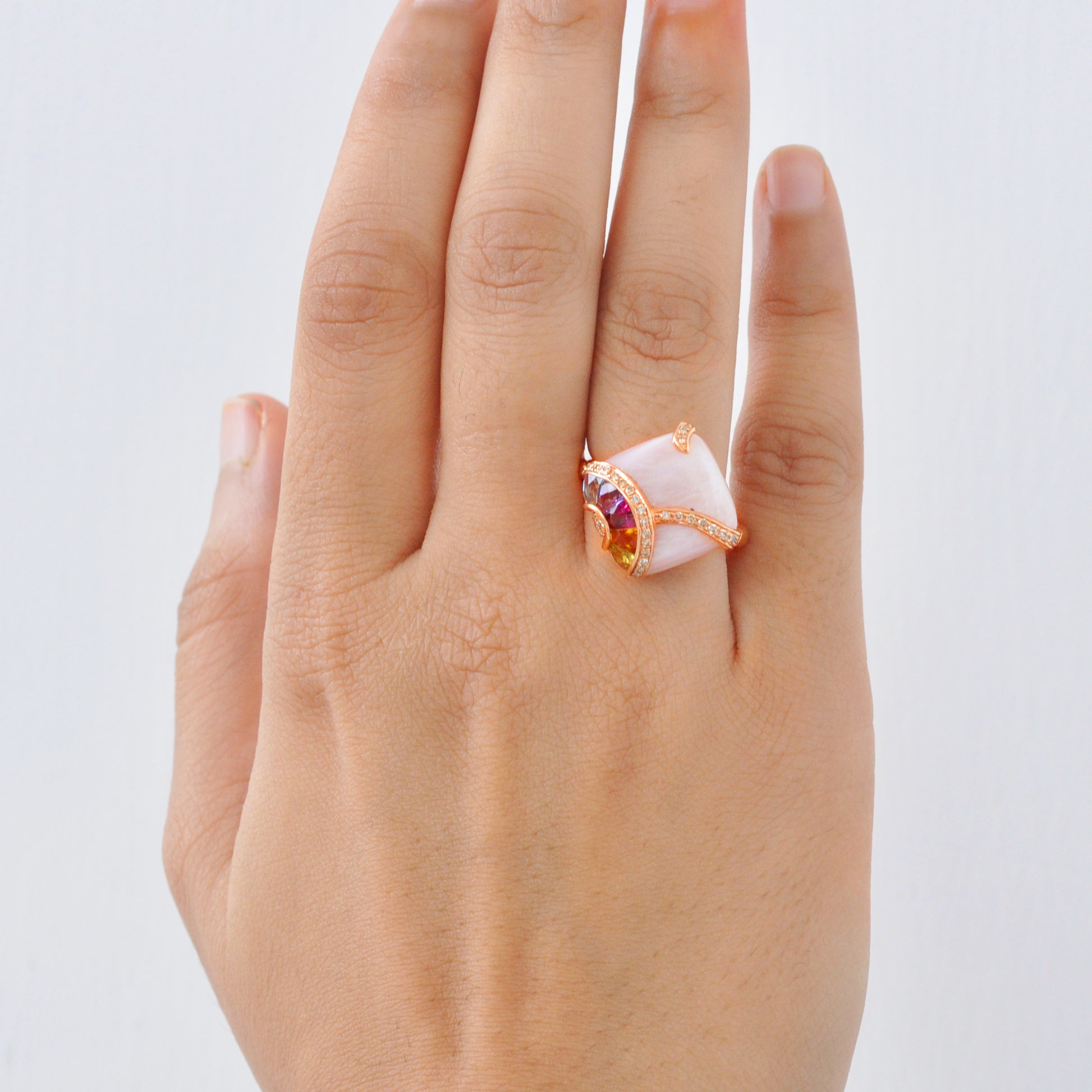 From our Couture Collection, this enchanting ring celebrates the poetry of color and craftsmanship. Handcrafted in 14K gold, the design centers around a luminous Pink Mother of Pearl cabochon — its soft iridescence evoking a delicate glow that shifts beautifully with the light. Surrounding it, a symphony of gemstones — Peridot, Citrine, Rhodolite, Amethyst, and Swiss Blue Topaz — frame the centerpiece with jewel-toned brilliance, creating a refined contrast of pastel warmth and vibrant radiance.