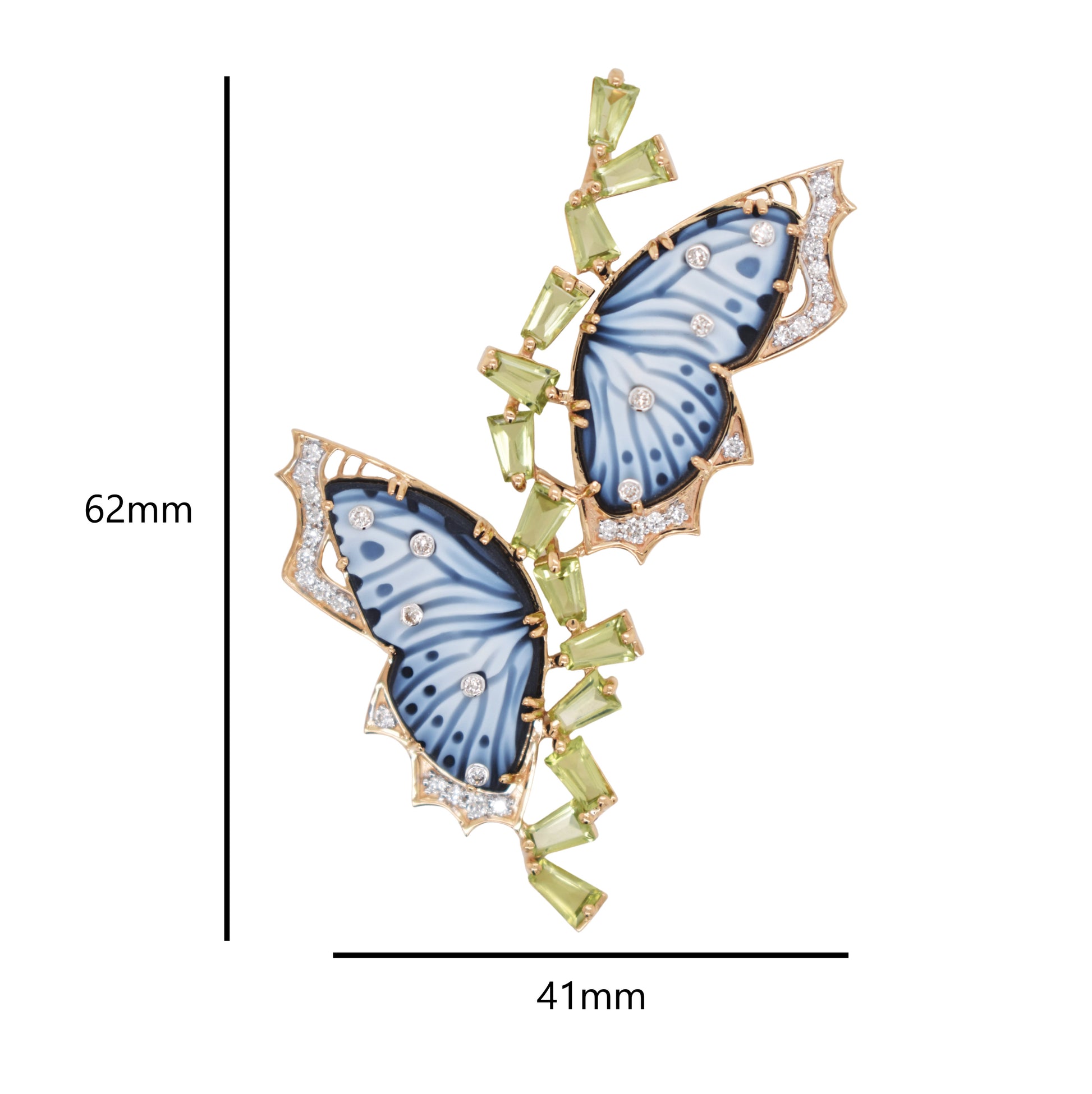 A breathtaking ode to nature and artistry. This 14K Gold Butterfly Pendant showcases a hand-carved blue Agate butterfly, intricately detailed with sparkling diamonds and gracefully framed by a cascade of vivid green Peridot baguettes. A unique, luxurious statement piece.