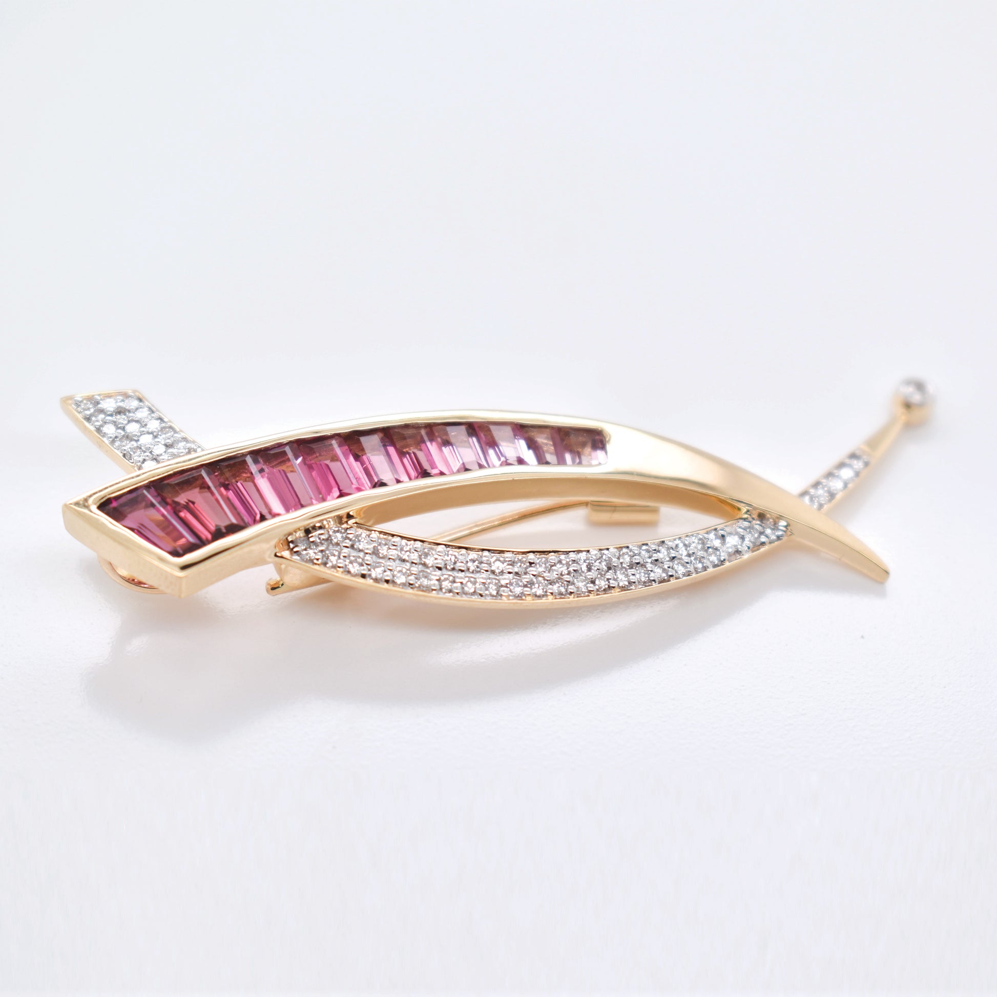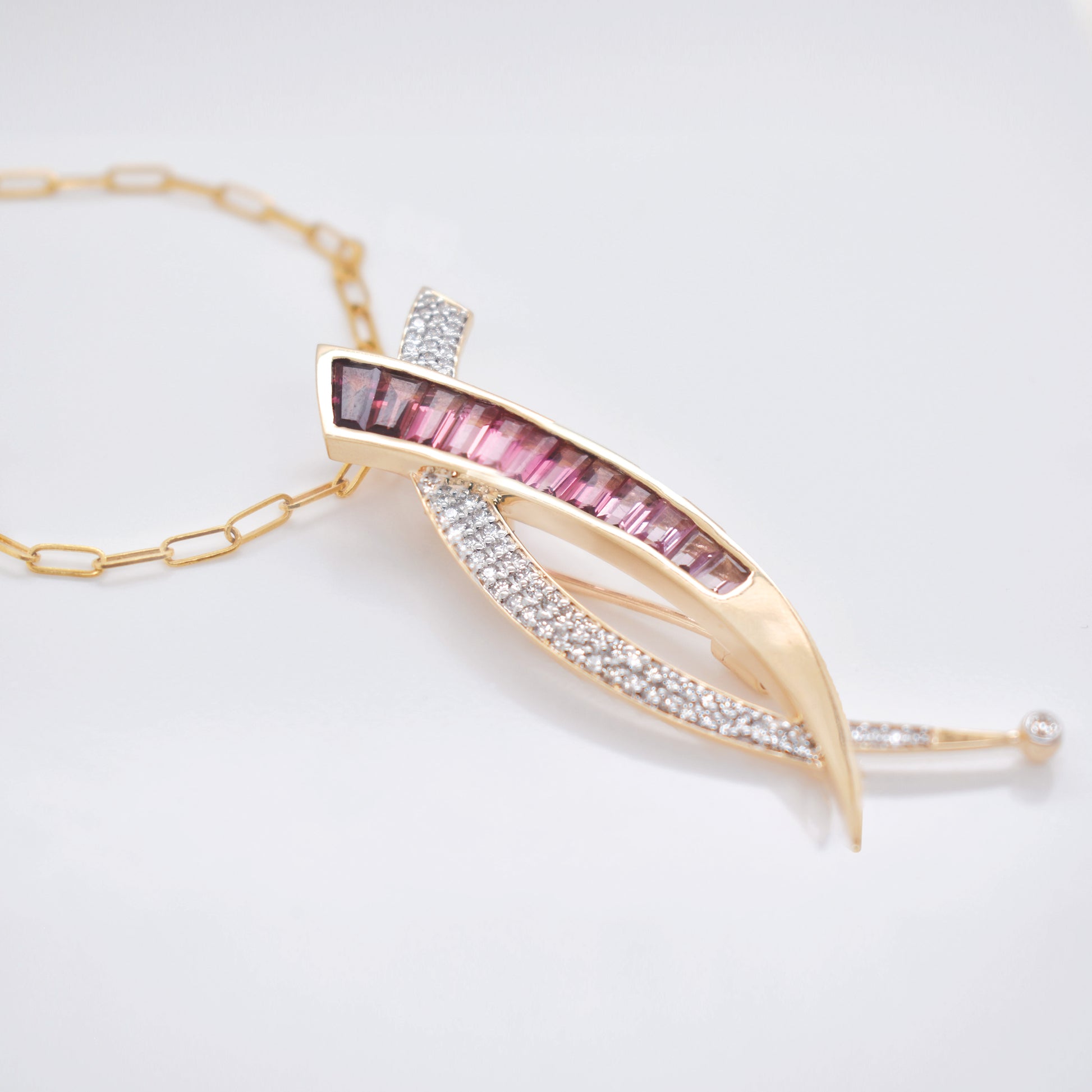This elegant, sword-shaped brooch/pendant is cast in gleaming 14K gold, showcasing a brilliant gradient of precision-set pink tourmaline baguettes and diamond accents. Versatile and gender-fluid, this statement piece evokes both grace and power in a wearable work of art.
