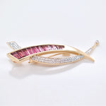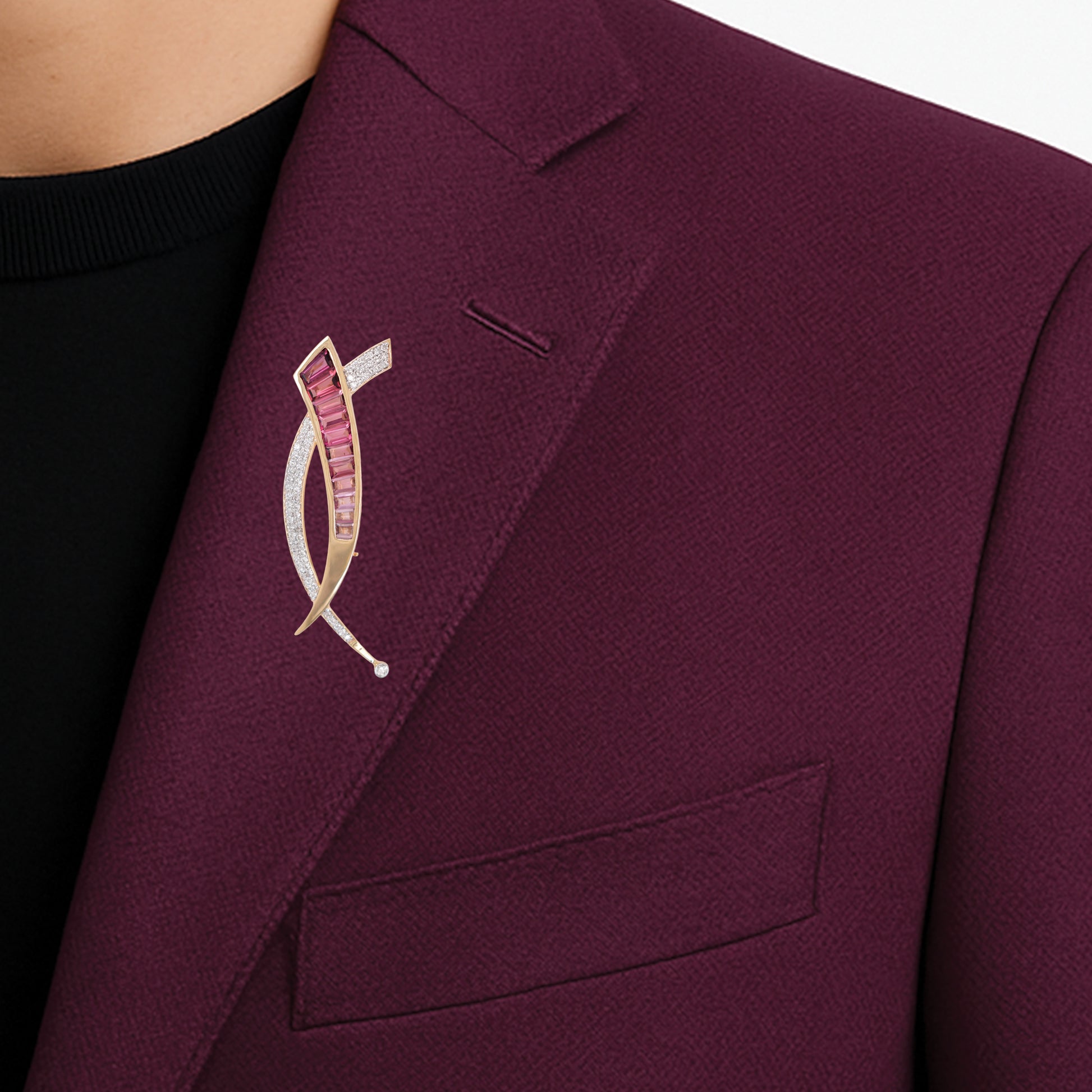 Expertly fashioned in 14K gold, this sword-shaped brooch features a dazzling, fluid gradient of precision-cut pink tourmaline baguettes, transitioning from soft blush to deep magenta. Delicate diamonds enhance its dynamic silhouette. Designed with a hidden bail, this gender-fluid piece can be worn as a brooch or a pendant, symbolizing refined craftsmanship and graceful power in a single, modern statement.