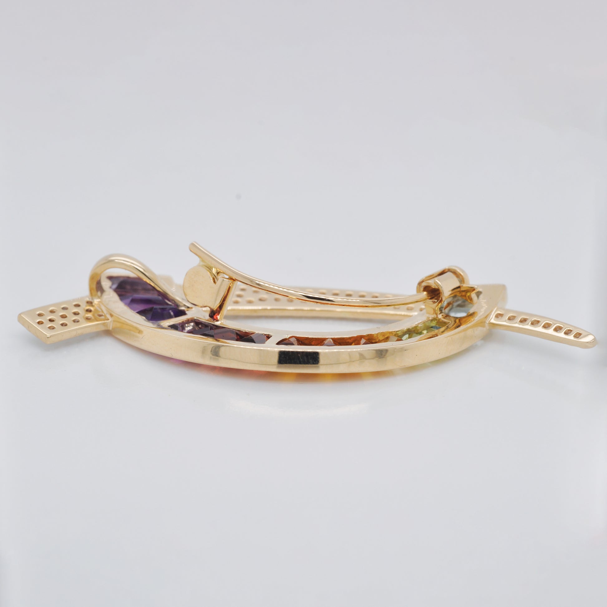 This versatile 14K Gold Brooch-Pendant features a sleek "D" silhouette adorned with precisely calibre-cut tapered baguette multicolored gemstones and sparkling pave diamonds, perfectly balancing color, culture, and high-end art.