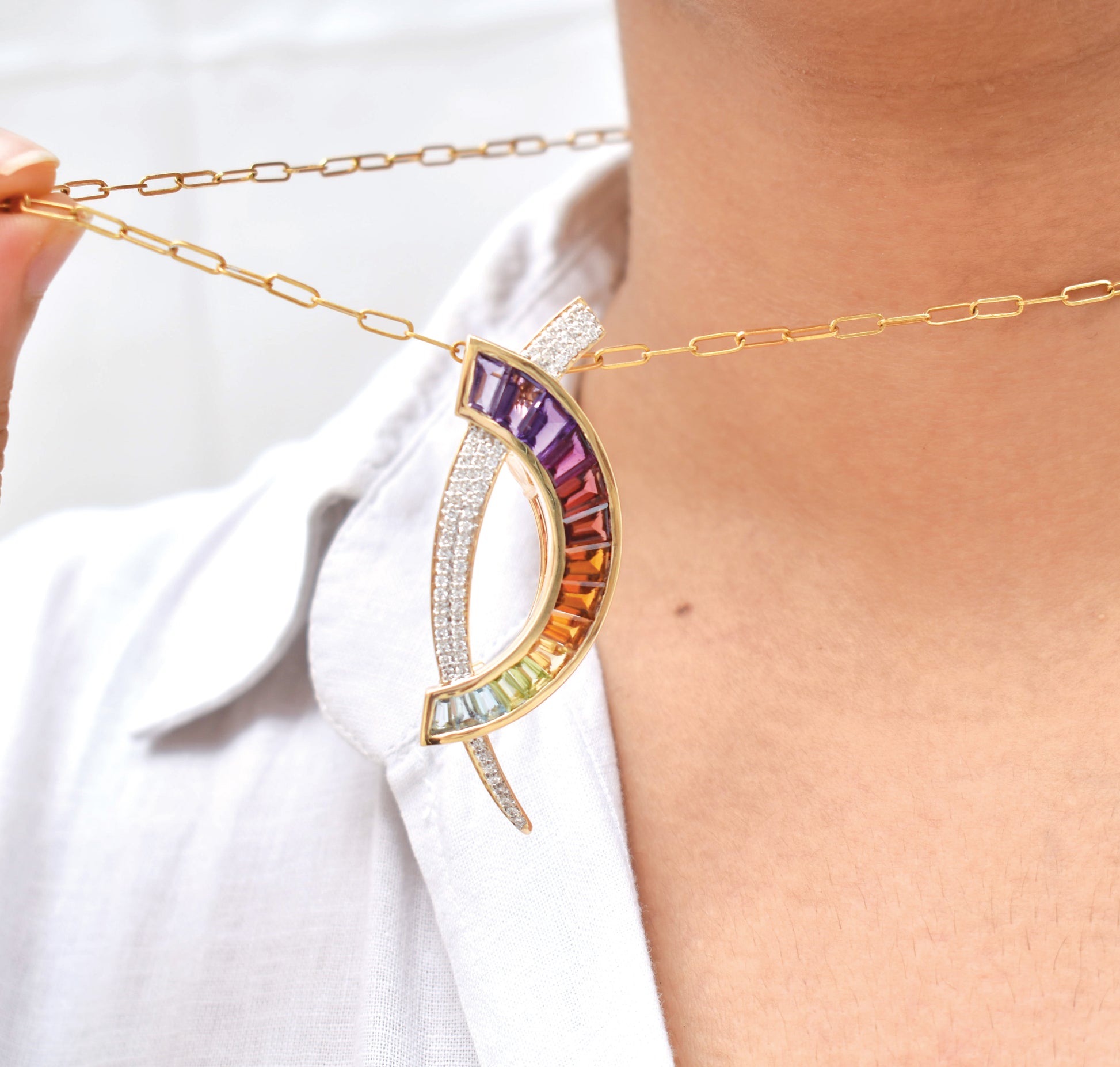 Art, color, and culture converge in this original Vaibhav Dhadda creation — a contemporary 14K gold brooch-pendant designed with calibre-cut tapered baguette multicolored gemstones and diamonds. Each hand-selected gemstone, including Citrine, Peridot, Tourmaline, Amethyst, Topaz, Iolite, and Garnet, is precisely calibre-cut in varying tapered baguette shapes to fit the design, enhancing their brilliance and fire. Pave-set diamonds further elevate the piece, adding refined sparkle to the bold color play.