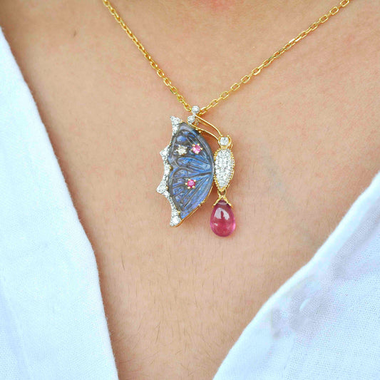 Labradorite Butterfly Pink Tourmaline Pendant Brooch